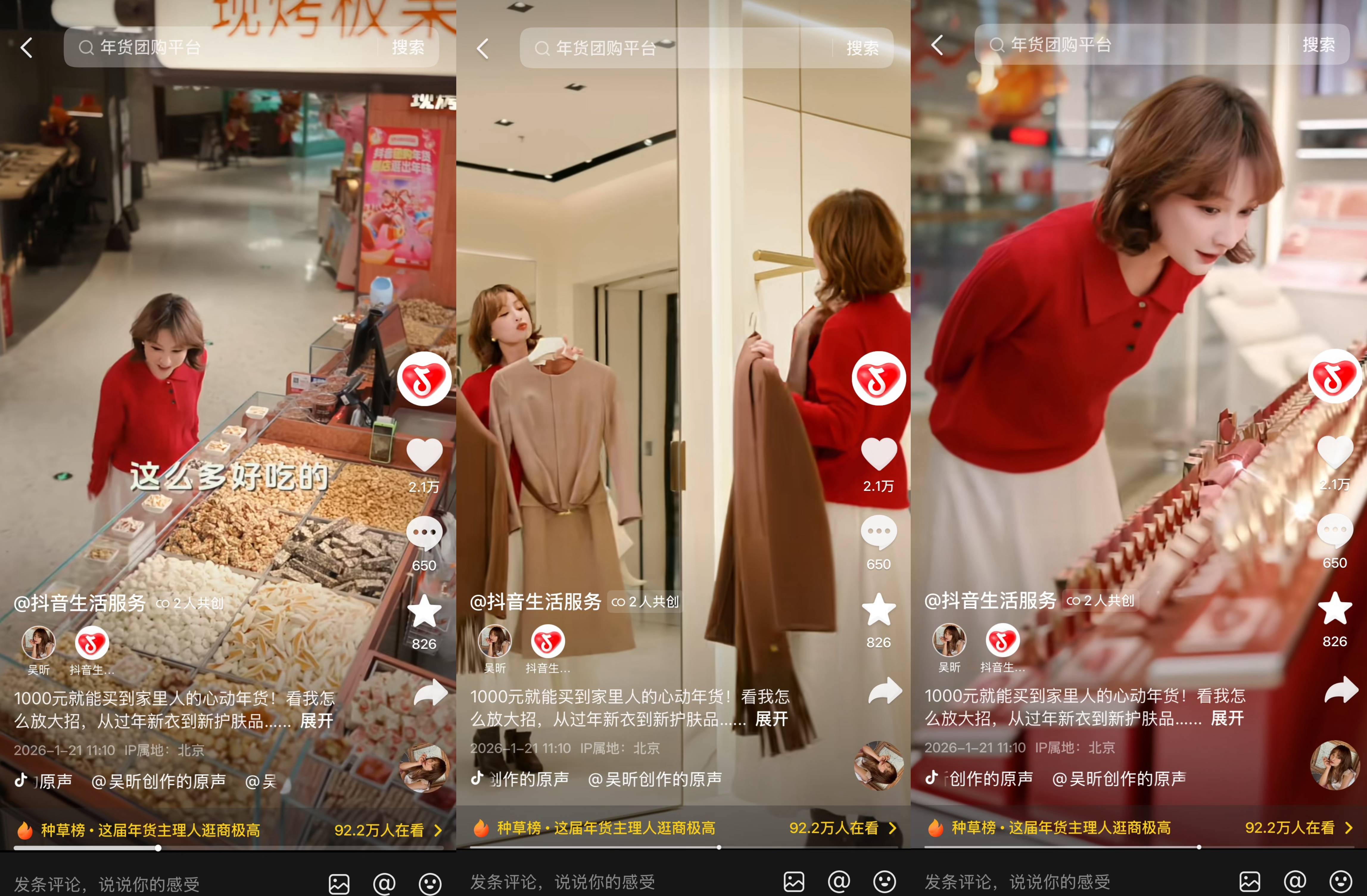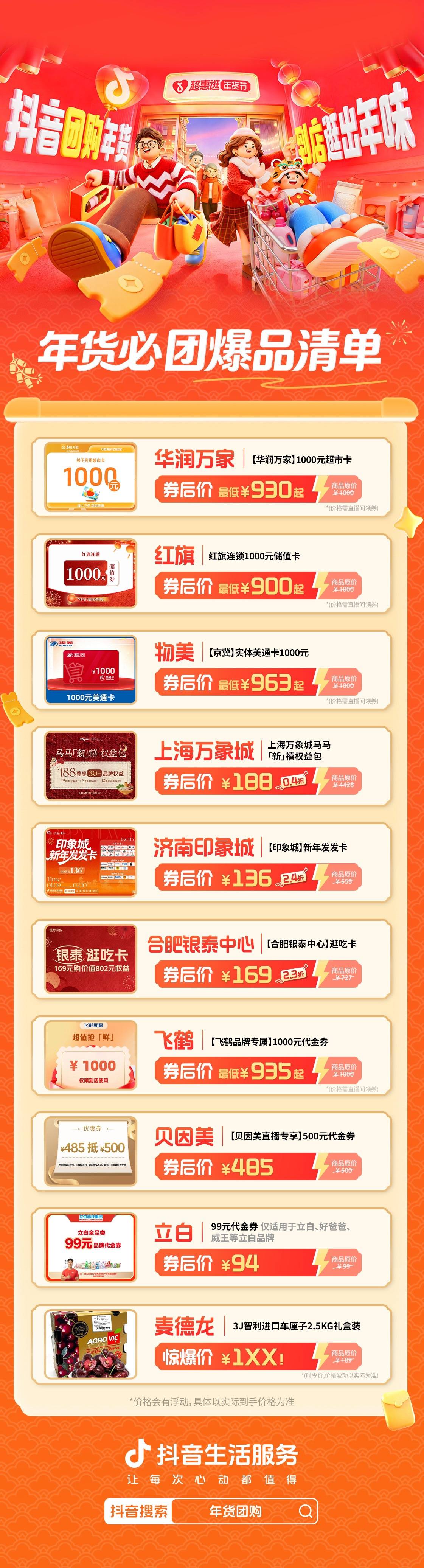 《 环球日报 》 春节假期还没到,不少人已经打起了“年货算盘”:日用百货少不了、零嘴美食必须上、新年焕新变美的服饰鞋帽和美妆护肤品样样都得齐全……想要的太多,“买什么年货”、“去哪买年货最省心”也成了大家“甜蜜的烦恼”,期待的背面是选择太多挑花了眼,想买得好又要花时间精打细算。 既想花更少的钱团到更好的年货,又期待逛街挑选时的那份热闹与仪式感? 01 . 吴昕海涛教你轻松扫年货,用千元承包全家的快乐 走进商超看着堆成山的年货,一不小心就“上头”超预算?冷静!跟着「超惠逛年货节」代言人吴昕、杜海涛一起先团后逛,精准拿捏好货好价! 从妈妈手中接下年货置办权的海涛,用1000元预算就让大家刮目相看。先在抖音团上一波心动好品,把妈妈想吃的、家人平常舍不得多买的统统拿下,从海鲜大菜,到生鲜水果、粮油米面、酒水饮料、零食......大手一挥,用团券的底气精准掌控千元预算,“先团后逛”的省心程度,连妈妈也忍不住和朋友们电话炫上一波。想带着家人一起买好年货的,跟着海涛的节奏就“购”了。 同样是先团后逛,跟着吴昕思路打开,去商场挑些精致年礼,新衣、护肤套装、化妆品……无论送给妈妈、姐妹,还是犒赏辛苦一年的自己都合适,领券叠加商场优惠折上折,轻松把千元预算的购买力拉满! 02 . 年货节券包天天领,超值大额券和免单优惠等你来抢 看完了吴昕、海涛的千元年货“优秀作业”示范,别忘了来抢券“实战”!活动期间,抖音搜索“年货团购”进入活动主会场,每天10点、19点最高可抢1188元年货券,从吃喝玩乐到商超爆品都能用!线上团购各类新式“年礼”,还能用定制年味礼赠卡写下独家祝福,将券直接转赠亲友,把心意即刻送达! 03 . 达人陪你探索采买灵感,跟着爆品清单趣逛超值好货 更多有趣的年货采买玩法,点开#这届年货主理人逛商极高 话题就能看到。@大眼东、@放扬的心心、@维多利亚夫妇 等多位达人将带你把千元预算玩出新花样,可以和好友互送年货“盲盒”、用千元预算团出万元“排场”、“特种兵”式高效搞定全家年货……把快乐和年味一起拿下! 面对海量商品挑花了眼也不要紧,还有“年末必团爆品清单”帮你划好重点。从大型商超购物卡到品牌代金券、节日礼盒,涵盖商超、日用、生鲜水果等多个品类,超值好货放心跟团,省时省心不踩雷。 结语: 今年春节,不必再为“团什么年货”纠结,现在上抖音搜索“超惠逛年货节”,跟着明星达人“先团后逛”,抢最高1188年货券包,就能以实惠价格购齐丰富年货,参与话题投稿还有机会赢千元免单福利!快带上家人一起解锁年货采买新方式,把新春好物、实惠与心意统统打包带回家! 特别鸣谢! 日化行业:首席合作-立白,联合赞助-杜蕾斯,行业合作-中国拉芳、ABC、沙宣 食饮行业:首席合作-三得利,联合赞助-好欢螺,行业合作-斯利安、物美/WUMART 服饰行业:首席合作-李宁,行业合作-龙牙战术服装、中乔体育、拓路者PIONEER CAMP、SAINT ANGELO 报喜鸟、 红豆居家、柒牌男装、鸿星尔克 美妆行业:特约合作-修丽可、娇韵诗,行业合作-BABI、希思黎Sisley 编辑:林然 |