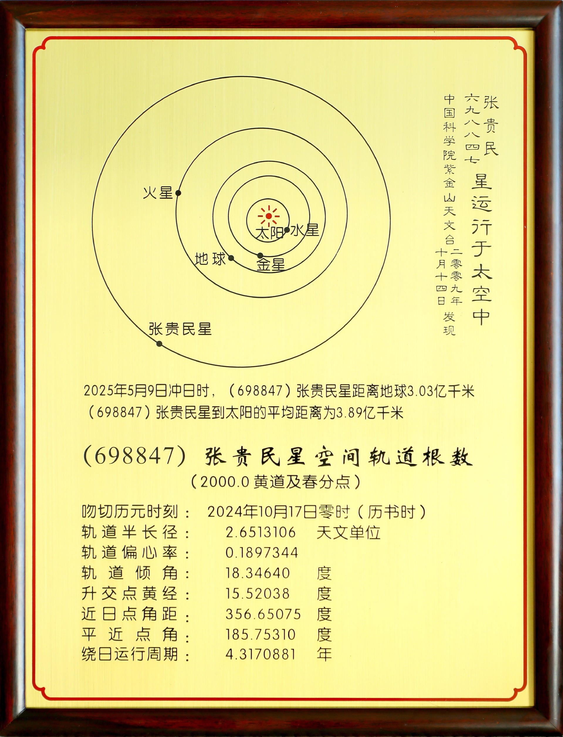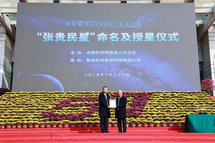 《 环球日报 》 科技日报记者 王延斌 10月28日,“张贵民星”命名及授星仪式在山东省临沂市鲁南制药集团隆重举行。国际天文学联合会小天体命名委员会正式批准,将编号为698847的小行星永久命名为“张贵民星”。从此,浩瀚星河中又多了一颗以中国人名字命名的星辰。 这颗小行星是经由中国科学院紫金山天文台2009年10月14日发现,并经过多次精密轨道测定和国际认证程序后,最终获准命名。小行星命名是国际公认的崇高荣誉,通常授予在科学、文化、社会等领域作出卓越贡献的杰出人物。以科学家之名命名小行星,不仅是对其个人成就的肯定,更是对科学精神的礼赞与传承。 张贵民是我国著名药学专家,中国手性制药工程的领军人物,在中药经方传承发掘与现代中药制药融合创新方面作出了杰出贡献,带领鲁南制药集团在制药科技领域攻坚克难、创新争先,通过技术创新驱动医药产业升级,形成了从基础研究到产业化应用的完整链条,为中国制药行业的自主创新和高质量发展作出了重要贡献。 在命名仪式上,中国科学院紫金山天文台党委委员赵海斌表示,以一颗小行星为张贵民誉名,体现了国际社会对张贵民研究员科技成就的褒扬。这不仅是张贵民研究员的光荣,也是鲁南制药集团的光荣,更能弘扬和传承科学家精神,激励科技工作者不懈奋斗、勇攀高峰。 中国科技发展基金会理事长宋军指出,这颗以张贵民名字命名的小行星,巧妙地融合了张贵民的人生轨迹、企业成就与科学使命,成为人类探索未知、追求卓越精神的永恒见证。这一荣誉,不仅是对张贵民个人价值的星际认证,更是对所有为科技进步和社会发展默默奉献者的最高赞誉。 “这份荣誉不仅属于我个人,更属于所有并肩奋斗的鲁南制药科研同仁,属于我们伟大的祖国。”张贵民表示,科学探索之路漫长而孤独,但只要心中有光,便不惧黑暗。他愿做一颗铺路石,为后来者照亮前行的路。“这颗‘张贵民星’,将是我一生科研旅程中最璀璨的注脚,也将激励我继续在科学的星海中不断求索。”他表示。 在仪式现场,大屏幕上播放了“张贵民星”的轨道模拟动画——它静静地运行在火星与木星之间的小行星带中,周期性地绕日旋转,仿佛一位沉默的守望者,见证着人类文明对宇宙的不懈追寻。 (受访者供图)  |