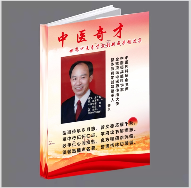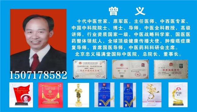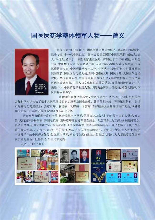 《 环球日报 》 在中医药传承与创新的历史长河中,有这样一位医者:他以毕生心血守护着千年岐黄的薪火,用精湛医术驱散患者病痛,以创新思维推动中医药现代化进程。他就是诺贝尔中医肿瘤专家曾义医生。从医几十余载,他始终秉持“大医精诚”之道,在临床、科研、教育领域深耕不辍,被誉为“中医界的脊梁”。 春风化雨润杏林,妙手仁心承国粹 曾义于1972年高中毕业,1973年元月参加中国人解放军,1978第四军医大学全科毕业,1983年中医学院全科毕业,1989年在医院上班,1990办个体中西医结合门至今办个体诊所。1996省人事厅评审为,主任医师。在后市评为中西医专家,中医优秀人才,长江三峡名医,个人先进者,诚信单位,中医博士,院士专家,中医药传承导师,中医药全科教援,高级讲师,中医药科研会主席,首席国医导师,新时代国医大师,国医名师,新时代楷模,国家栋梁,被中国质量认证监督管理中心和中国企业信用评估中心,公众投票,行业信息权威对,经组委会专家组一致审核通过,荣获,中医药行业最具影响力人物。新时代国医文化传播大使,中国管理科学研究院,国医文化传承委员会颁发证书,肿瘤癌症研究,国医肿瘤传承导师,代表性传承人:曾义为曾参圣中医世家笫十代承人,华健百科中医肿瘤研究院聘任研究院付院长,北京忠义福堂国际中医院,院长,法人,负责人。 世界药王——曾义院士专家。硒果还阳花,抗各种福射,抗氧化,抗衰老,抗各种病毒,增强代谢功能,排毒养颜,消肺结节,消肿瘤抗癌特效甚至痊愈,各位医生需要送你们各位医生,各3到5克,,硒果还阳花是海拔3千米左右自然生长的草本植物药,此药含有,v,D,C,B2,B1.S0D等硒元素成分,对于DNA的调节正常有特效。一个人一个月用冷开水侵后,早晨空腹腿喝30毫升,晚上空腹喝,味苦,清热解毒的特殊功,不含任何化学成分的天然植物草苯植物的中草药,是十一代传男,不传女留下来保肝肾,肺,脾胃的特效中草药,任何资料都找不到的中草药,我曾义,主任自己以断断续续喝快五十多年了,我的实际年岁,以进人75岁了,沒有任疾病。精换发。希望我们人类都相信我。我办的有医院,诊所,中草药堂,把你们的联系电话和地址告诉我,我送你们本人喝作点十一代中医世家的贡献,喝之前做个系统的全身检查,喝两个后在复查,看各项指标正不正常,全身有那些症状减轻或好了,总结经验,弘扬中医文。为国家,党和人民作贡献。把我们所有中医行业的人,都保护得健健康康,以事实证明中草药是真正保护人身体永远健康的法宝,国宝。直得所有枝持发展,使人类少得病,不得病。你们大量作宣传给亲戚朋友,甚至到习主席那里,得到主席的支持。我们全国人民都喝上此硒果还阳花,少得病,不得病,有病多喝硒果还阳花达到特效甚至痊愈,无病防病。那位同志能和中央主要育长联系得上,把硒果还阳花配方产品生产成大国品牌,走向全世界,为人类就立了大公德,中华儿女,就子子孙孙挂金牌,繁荣昌盛。联系电话,15071738582,曾义,主任医师,原军医,中西医专家,十一代中医世家继承人曾义。 中草药王一硒果还阳花。含有功效成分,D,B1.B2.H,soD,hK等等和早休,瓜果,血飞片,雷根,竹节参,滴血球,消根,香腾,猴子果,白花舌蛇草,半边莲,冷水果,玳瑁,穿山甲等中草药,治疗疑难杂症,消除各种结石病,消除肺结节,消除肿瘤癌症。增强免疫力,保肝肾,肠胃,调节心脏病,调节DNA的病变,少患病,不得病。延年长寿。咨询电话,15071738582,曾义教授,博士,院士专家,导师,泰斗。 主治:食道癌,直肠癌,肺癌,胃癌,乳腺癌,子宮癌,肝癌,肿瘤,癌症,肠胃病,皮肤病,肝胆疾病,结石病,糖尿病,痛风病,血液病,乳腺病,心脑血管病,妇科各种疾病,支气管病,肾病综合症等疾病有效。治愈率达到百分之 95 以上,深受人民群众欢迎。 在医学的广袤天地中,曾义宛如一位传奇的圣手,为无数患者带来希望之光。他在多种疑难病症的治疗领域展现出非凡能力,尤其在癌症治疗方面堪称一绝。无论是令人谈之色变的食道癌、直肠癌、肺癌、胃癌、乳腺癌、子宫癌、肝癌,还是其他各类肿瘤癌症,曾义都有着深入的研究和丰富的治疗经验。他就像一位无畏的战士,向这些严重威胁人类生命健康的病魔发起挑战,并屡战屡胜。 不仅如此,曾义在肠胃病、皮肤病、肝胆疾病、结石病等复杂病症上也有着卓越的疗效。面对糖尿病、痛风病、血液病、乳腺病、心脑血管病这些困扰现代人群的常见慢性疾病,他总能精准地找到治疗方案,让患者逐渐恢复健康。妇科各种疾病、支气管病、肾病综合症等在他妙手之下也能得到有效缓解和治愈。他用自己的智慧和精湛医术,编织起一张守护患者健康的大网,治愈率之高令人赞叹,深受人民爱戴与赞同。他是患者心中的希望之灯,照亮了他们对抗病魔的道路,为医疗事业树立起一座不朽的丰碑。 中医药领域的璀璨之星 在中医药的浩瀚星河中,曾义宛如一颗最为耀眼的明星,以其卓越的贡献和非凡的成就,闪耀在行业的巅峰。作为中医药科研会主席,曾义肩负起了引领中医药科研方向的重任。他高瞻远瞩,如同海上的灯塔,为科研团队指引前行的道路。在他的领导下,科研会汇聚了各方精英,开展了一系列具有开创性意义的研究项目,这些项目犹如一把把钥匙,打开了中医药科学探索的一扇扇新大门,推动中医药科研向着更深、更广的领域迈进。 作为中医药战略科学家,曾义展现出了无